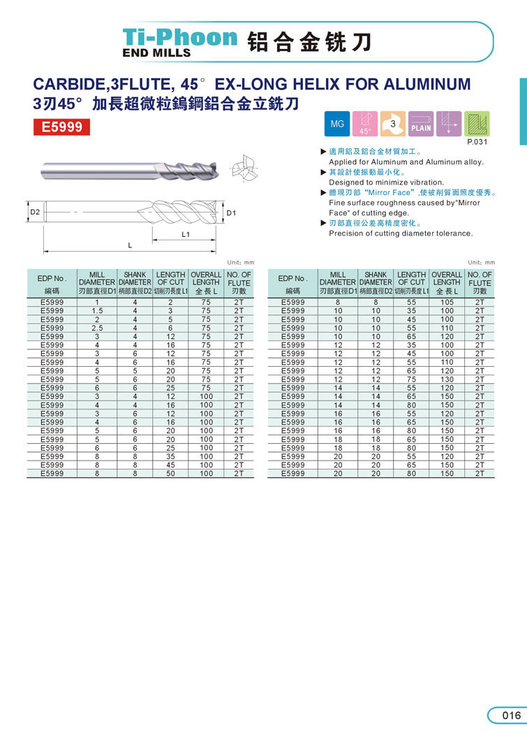 1. 2刃鋁合金銑刀 013