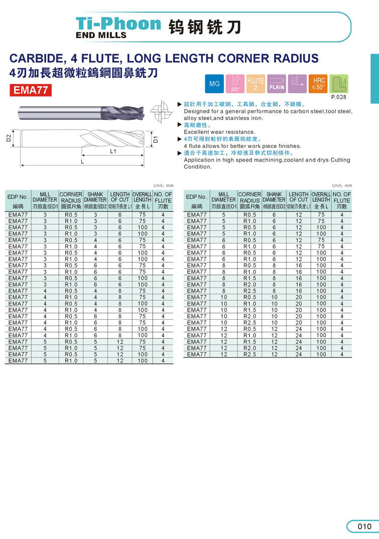 4刃加長(zhǎng)超微粒圓鼻鎢鋼立銑刀010
