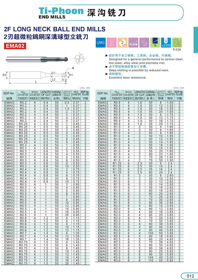 12. 2刃球型超微粒鎢鋼深溝立銑刀012